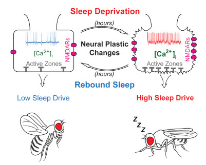 睡眠需求和鈣離子的水平和R2神經(jīng)元的突觸強(qiáng)度有關(guān)。睡眠需求增加的果蠅,鈣離子水平的提高、NMDA受體的增加、突觸活性區(qū)膜面機(jī)增大;睡眠反彈時(shí)的果蠅,鈣離子水平的降低、NMDA受體的減少、突觸活性區(qū)膜面機(jī)變小,說明突觸形態(tài)結(jié)構(gòu)的可塑性變化和睡眠的自我平衡有關(guān)。