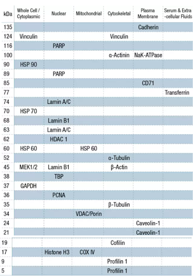 內(nèi)參蛋白主要是一些持家基因,這些持家基因執(zhí)行大量的基本功能,并持續(xù)在多種組織和細(xì)胞中高水平表達(dá)。 常見內(nèi)參蛋白包括Actin、Tubulin、GAPDH、Histone H3等。但是,研究不同類型的蛋白,對內(nèi)參的選擇是有講究的,如1)胞漿蛋白的內(nèi)參與胞核蛋白的內(nèi)參是不一樣的;2)在一定的實驗條件下,內(nèi)參蛋白的表達(dá)發(fā)生明顯的變化時需要選擇其他表達(dá)不變或者變化很小的蛋白;3)當(dāng)研究的蛋白的分子量與內(nèi)參接近時,需要選擇分子量與目的蛋白的分子量差距比較大的蛋白等。