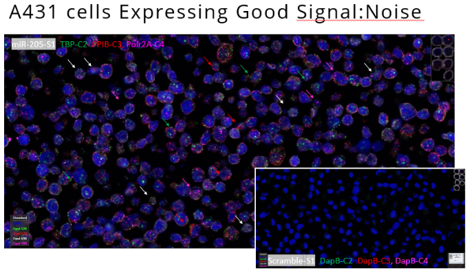 得益于ACD專利的探針設(shè)計(jì)及信號放大技術(shù),小RNA分子及mRNA分子的信號最終都可獲得高信噪比。下圖展示在細(xì)胞片中對miR-205和3個mRNA的陽性對照探針及陰性對照探針的檢測。陽性對照中各個通道上的信號點(diǎn)清晰,陰性對照中全片非常干凈,體現(xiàn)出方法的高特異性。