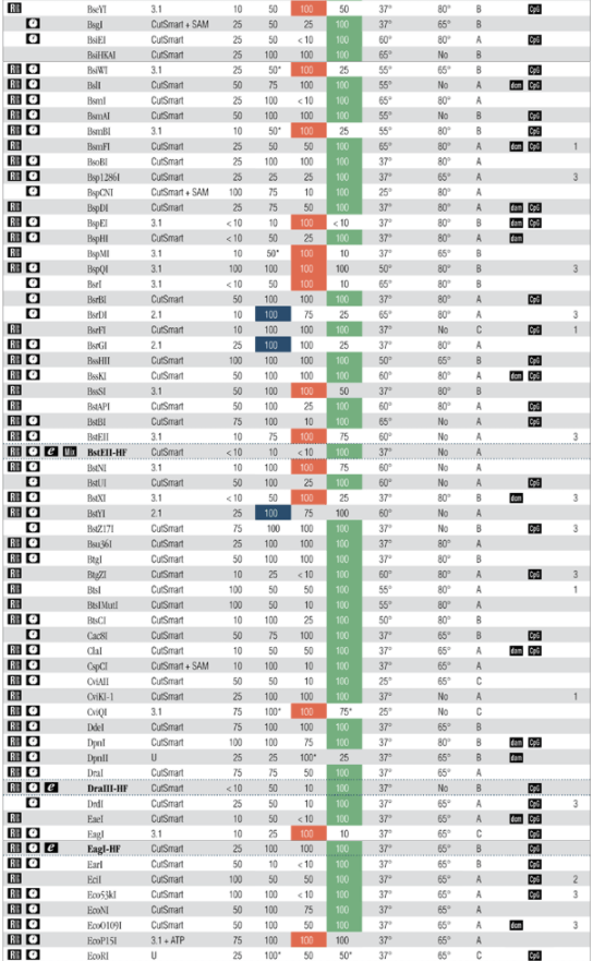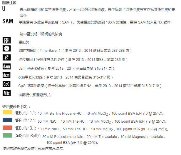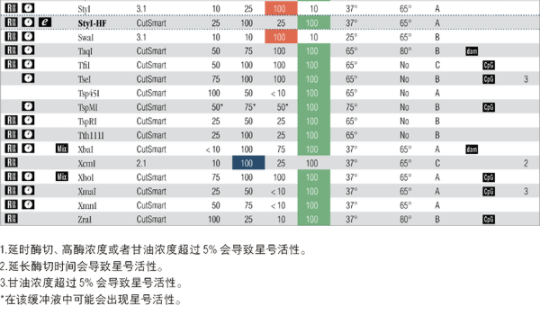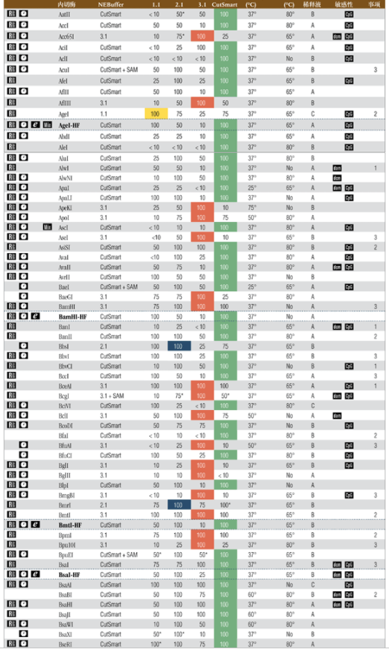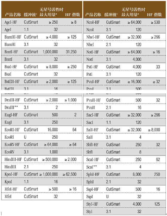 注:表中數(shù)值為近似值,所用底物與內(nèi)切酶定義中的底物相同,更新的內(nèi)容請查閱 www.neb-china.com 及