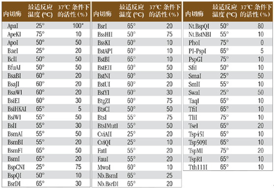 表中列出了限制性內(nèi)切酶的最適反應(yīng)溫度。對于最適反應(yīng)溫度不是 37℃ 的限制性內(nèi)切酶,請閱 2013﹒2014 商品目錄 284 頁查詢其在 37℃ 時的活性。