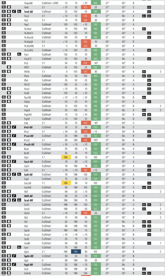 該表總結(jié)了 NEB 所有限制性內(nèi)切酶的活性信息。為了幫助您選擇雙酶切的最佳條件,該表列出了酶的最佳活性 NEBuffer(隨酶提供)和每種內(nèi)切酶在四個標準緩沖液中的活性。需要注意的是 BSA 現(xiàn)在已經(jīng)添加到緩沖液中,不再單獨提供。雙酶切反應(yīng)體系請參考 2013﹒2014 商品目錄第 276 頁。此外,活性表中列出了反應(yīng)溫度、熱失活溫度、推薦稀釋液、甲基化敏感性和該酶是否有省時酶特性(即在建議的反應(yīng)條件下,5-15 分鐘可完全切割底物,過夜酶切也不會降解 DNA)。