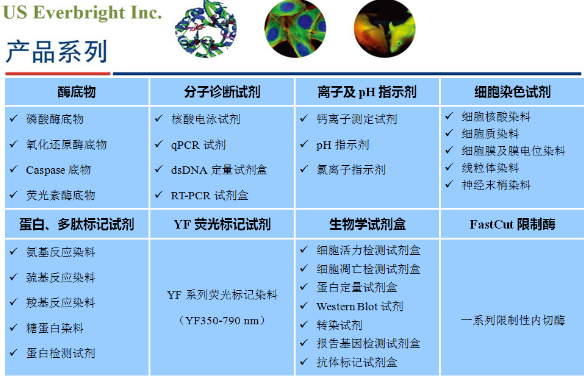 UE公司簡介:US Everbright? Inc.是一家由原Life technology Inc. 和Biotium Inc.兩家國際知名生物試劑公司的研發(fā)人員在美國創(chuàng)立的技術(shù)開發(fā)導向型企業(yè)。US Everbright? Inc.秉持“一流世界產(chǎn)品,一流專業(yè)服務(wù)”的宗旨,致力于為生命科學領(lǐng)域科研工作者提供最卓越的產(chǎn)品和最貼心的服務(wù)。