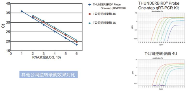 以檢測(cè)Flu病毒為例,模板拷貝數(shù)從101~106數(shù)量級(jí),THUNDERBIRD?Probe One-step qRT-PCR Kit按標(biāo)準(zhǔn)體系進(jìn)行,T公司的逆轉(zhuǎn)錄酶從1U增加到 4U,定量效果依然到不到本試劑盒效果。