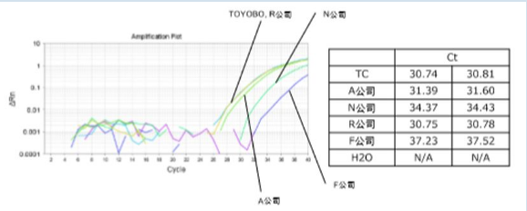 右圖,比較了檢測(cè)腸病毒RNA時(shí)Ct值。使用TOYOBO的UNG條件時(shí)檢測(cè)靈敏度沒有問題,使用其他公司的產(chǎn)品時(shí)Ct值出現(xiàn)了延遲。
