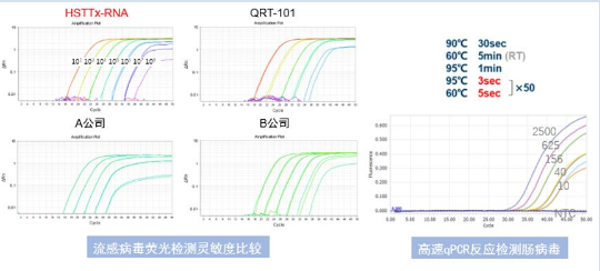 左圖,使用TaqMan探針法檢測(cè)不同濃度流感病毒樣本。首先抽提RNA進(jìn)行梯度稀釋(1x10^2 ~ 1x10^8),以相同條件檢測(cè)比較同類試劑盒檢測(cè)靈敏度。QRT為使用TTh酶的一步法定量試劑,可見HSTTX酶在處理實(shí)際樣本時(shí)效果最好。