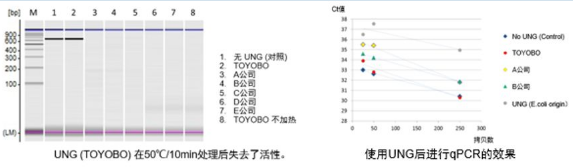 左圖,對(duì)比其他公司宣稱的熱敏性產(chǎn)品,50℃ 10分鐘處理后,將各UNG酶與含有U的PCR產(chǎn)物混合后37度進(jìn)行溫育。只有TOYOBO的UNG在50度10分鐘處理后失去活性,沒有分解掉含有U的PCR產(chǎn)物。