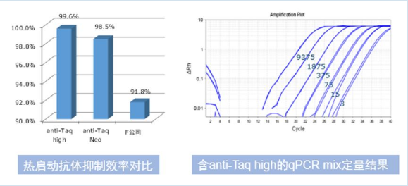 anti-Taq high是針對(duì)Taq DNA聚合酶的單克隆中和抗體,使用抗體熱啟動(dòng)法可以有效抑制非特異性擴(kuò)增,增強(qiáng)PCR的特異性和靈敏度。在進(jìn)入PCR循環(huán)前的預(yù)變性階段,Taq酶的活性即被完全激活,使用起來方便快速。此外,可提供用于凍干的無甘油版本。