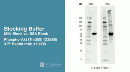 上圖是(Phospho-Akt (Thr308) (D25E6) XP??Rabbit mAb)?#13038 用來檢測經(jīng) PDGF 處理的 3T3 細(xì)胞裂解物的結(jié)果圖片。左側(cè)膜是用牛奶封閉,右側(cè)膜用 BSA 封閉。顯然,用 BSA 封閉的膜的背景更高。但用牛奶封閉膜時,磷酸化信號仍然很強(qiáng)且清晰。