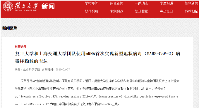 今天,復(fù)旦大學(xué)和上海交通大學(xué)在預(yù)印本網(wǎng)站ChinaXiv上,聯(lián)合報告了針對新型冠狀病毒SARS-CoV-2的mRNA疫苗研發(fā)的最新進(jìn)展,上海APExBio、藍(lán)鵲生物技術(shù)有限公司和廣州中山大學(xué)醫(yī)學(xué)中心也參與了該項目。